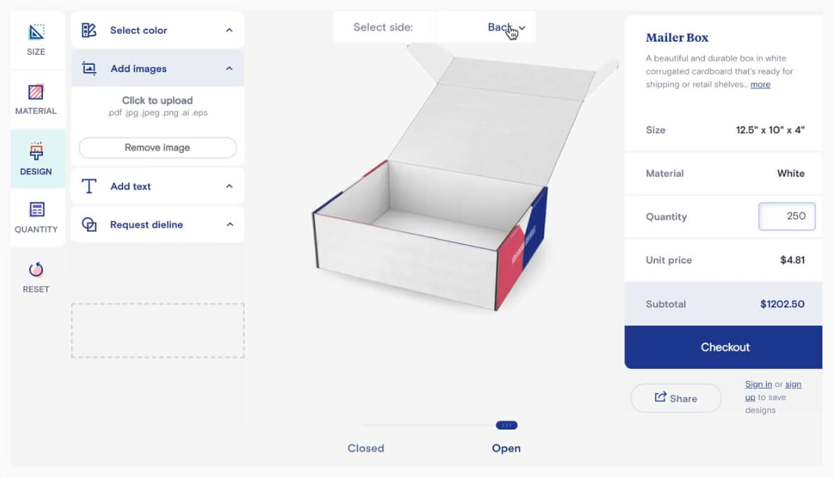 Select a size, a quantity, and start designing. Add images, text